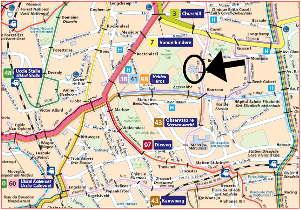 Pour les horaires des bus, trams et pré-métros : Accueil - STIB Liste des principales lignes « Tram / Pré-métro » → Ligne 3 – Esplanade – Gare du Midi – Churchill / Arrêt Churchill par l’av. Montjoie et rue Edith Cavell (15’ de marche) → Ligne 4 – Gare du Nord – Gare du Midi – Stalle / Arrêt Vanderkindere / Ligne 3 par l’av. Winston Churchill, l’av. Montjoie et la rue Edith Cavell (20’ de marche) → Ligne 7 – Heyzel – Gare d’Etterbeek – Vanderkindere / Arrêt Cavell par la rue Edith Cavell (10’ de marche)